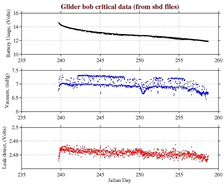 Closest Dive/Climb to<br>the Bottom/Surface Battery, Vacuum,<br>and Leak Detect Glider Tracks Surface Water Velocity